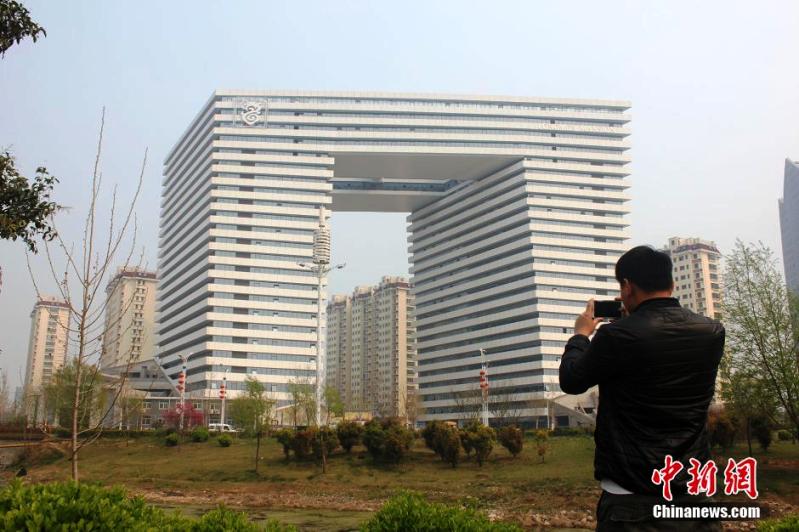 4月13日,河南省鹤壁市淇滨区淇水大道与珠江路交汇处,一栋即将完工的高层建筑横跨马路而立,外观酷似一个板凳,引得经过的市民纷纷驻足观看,连声称奇。据了解,“板凳大楼”是鹤壁市“9+1”重点工程项目之一,为河南省首座跨路景观大厦,占地面积41亩,总建筑面积约9万平方米,总投资约4.5亿元,由两栋高约86米的建筑横跨在珠江路两侧,宛如“龙门”形状。马义恒摄
