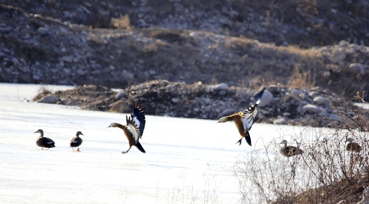 1月13日,一群野鸭在淇河新区段戏水。冬日的淇河大部分水面都结着厚厚的冰,偶有未结冰处,便是野鸭戏水的好地方。野鸭时而跃上冰面,时而潜入水中,时而发出呱呱的叫声。野鸭子成群戏水的场景成为冬日淇河一道亮丽的风景。